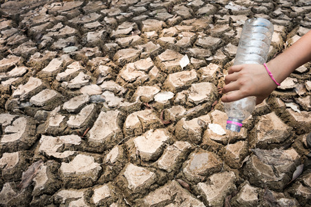 Drops of water falling from a child's hand onto a dried soil background. concept of water shortage in the world and drought. Water crisis and water shortage in summer during long drought is a global problem of drought on the planet