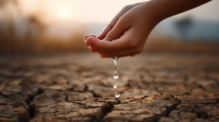 A closeup photograph of human hands cupping and pouring water onto parched, cracked earth in a dry landscape, illuminated by warm sunlight, showing water scarcity.