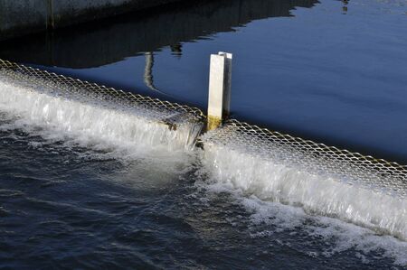 Small dam with flowing water and splashes, selective focus