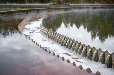 View of thickeners in wastewater treatment facility showcasing water flow and sediment separation process at sunset