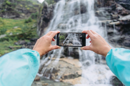 POV image of female traveler photographing with smartphone the waterfall outdoor