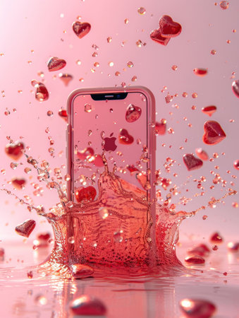 Watersplashed iPhone with heartshaped bubbles in the background, technology concept with romantic touch