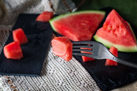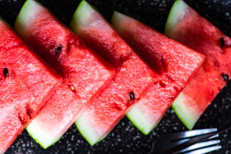 Fresh Fruits, Top View of Ripe and Sweet Refreshing Watermelon on Fork and Black Plate.
