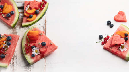 Slices of watermelon served with fresh berries. top view