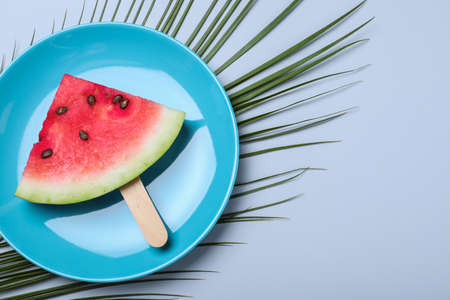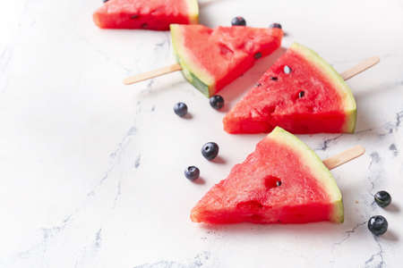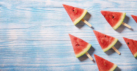 Slices of fresh watermelon with ice on a blue concrete background. Detox and vegetarian concept. Top view, copy space, banner.