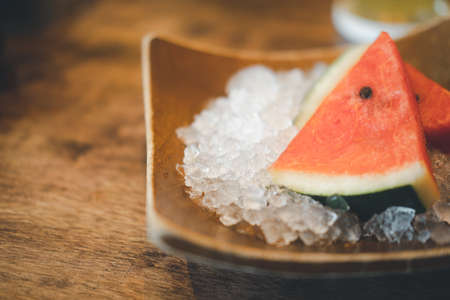 Close up of slices of watermelon served on ice