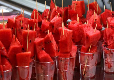 skewers of large slices of ripe red WATERMELON in the glasses for sale in the outdoor bar of the tropical beach