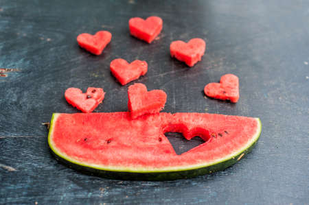 Piece of watermelon and hearts on the old wooden background. Space for text. Flat lay composition. love concept. Valentine's Day Concept