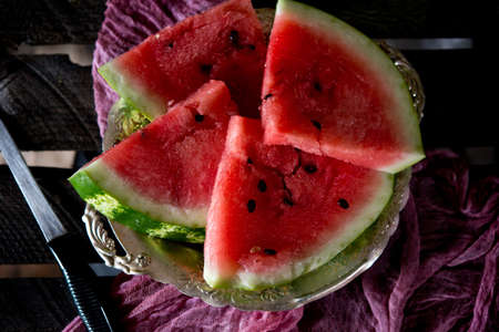Pieces of red seasonal watermelon on a rustic background