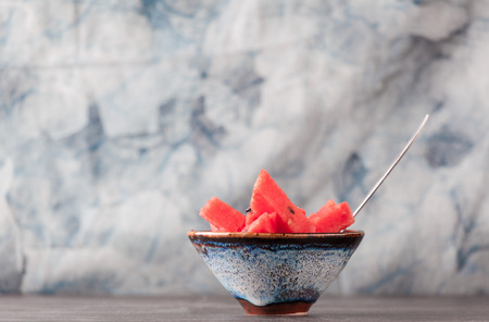 Sliced watermelon in handmade ceramic bowl with fork on blurred background. Copy space, shallow depth of field.