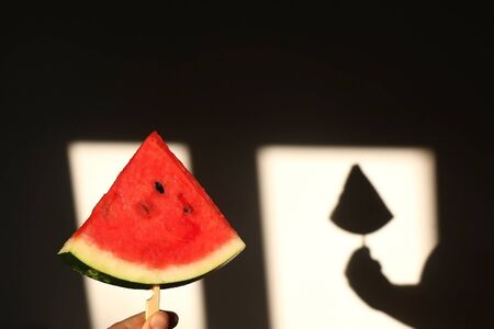 Unrecognizable person holding a slice of watermelon, illuminated by sunlight. Selective focus.