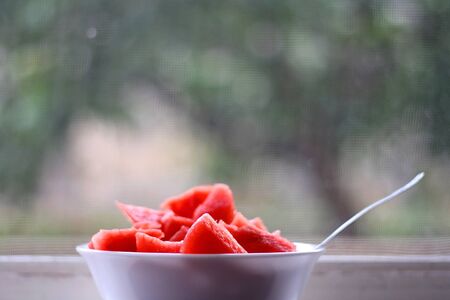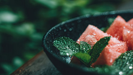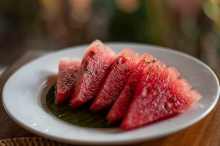 Juicy yummy Organic watermelon pieces in a decorative serving with mint leaves under sunlight during the touristic relaxation in the morning breakfast in summer season in Bali, Indonesia