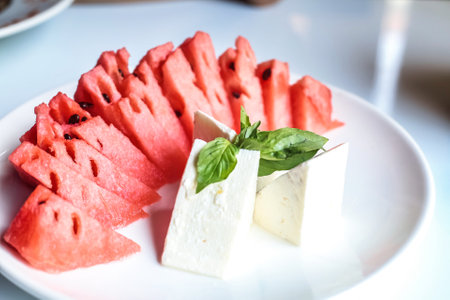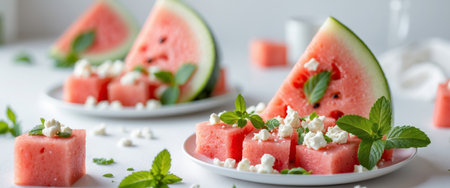 A white plate showcases slices of juicy watermelon and creamy cheese.