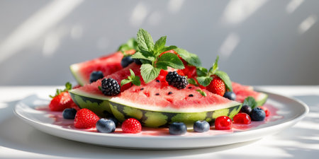 AI Generated. Vibrant summer fruit salad featuring watermelon berries and refreshing mint on a plate