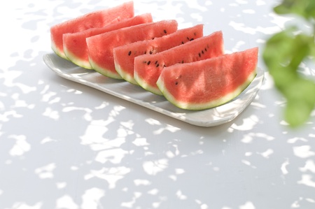 Freshly cut pieces of water melon on a plate outside