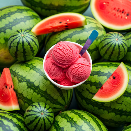A refreshing watermelon sorbet served on slice of fresh watermelon. AI generative image.