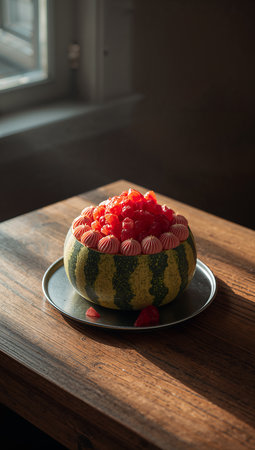 Raspberry cake in a watermelon bowl on a wooden table.
