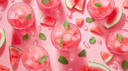 Frosty glasses of watermelon slushie surrounded by fresh watermelon slices and scattered mint leaves