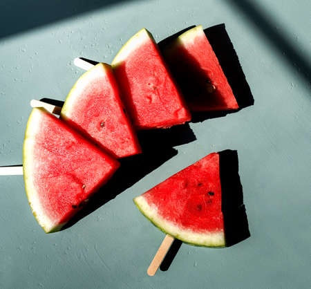Sliced watermelon on blue background. Watermelon under direct sun shine. Top view flat lay.