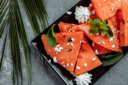 Fresh ripe slices of watermelon along with mint leaves lie on a plate on the table. Tasty and healthy, summer food