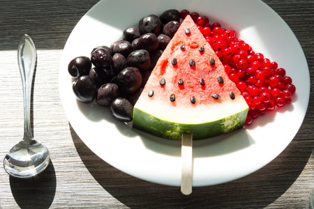 Organic watermelon slice on a plate served on stone background with copy space