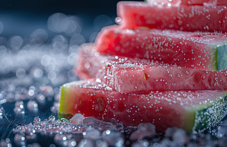 AI Generated. Two watermelon slices rest atop ice cubes on a table