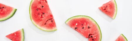 Slices of ripe watermelon lie on a white background. Top view, flat lay. Banner.
