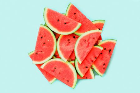 Ragged triangular portions of red seedless watermelon on pastel blue color background