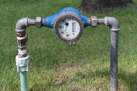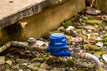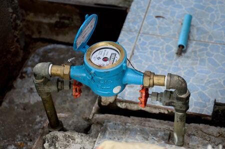 Close up water meter blue color in thailand. And a hose with flowing water.