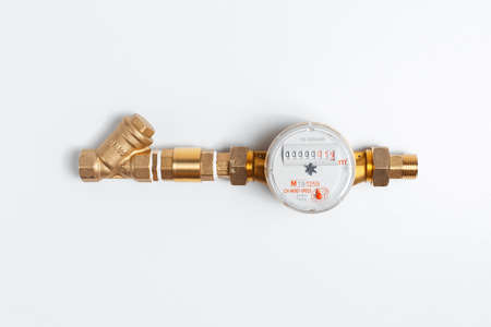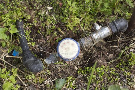 Water meter and valve on a water pipe close up. Plumbing abstract background.