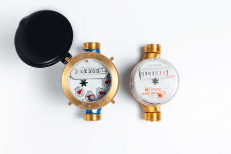 Close-up of two water meters for hot and cold water isolated on white studio background.