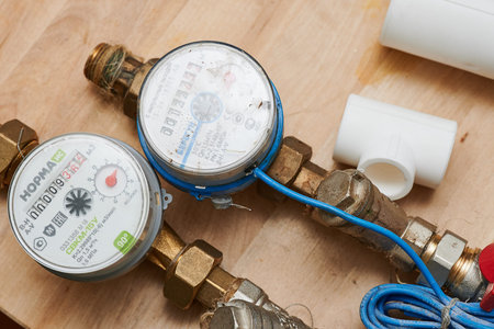 Detailed close up of water pipes and gas meters with water droplets and brass elements