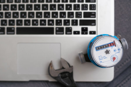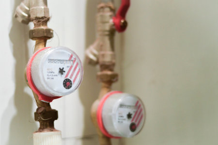 A detailed shot of a water flow meter connected to a pipe, measuring the amount of hot or cold water used for precise monitoring and efficient resource control.