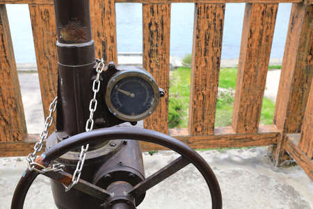 Wheel Controller of irrigation sluice ( watergate ) close up with rusty shutoff wheel in countryside, Japan