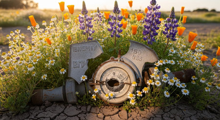 Industrial pipeline manifold with vintage brass valves and multiple pressure gauges in retro steampunk style against a gray wall, colorful dials and metal fittings