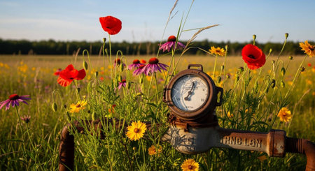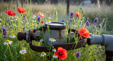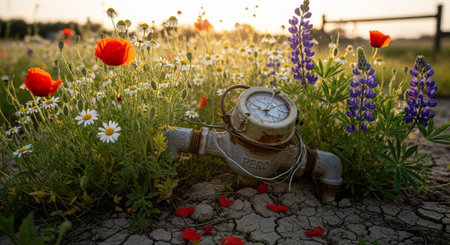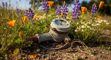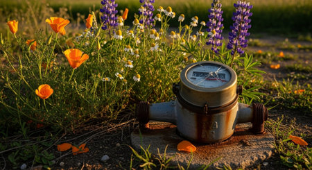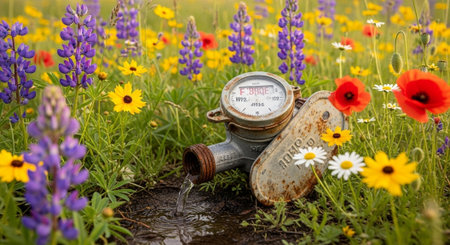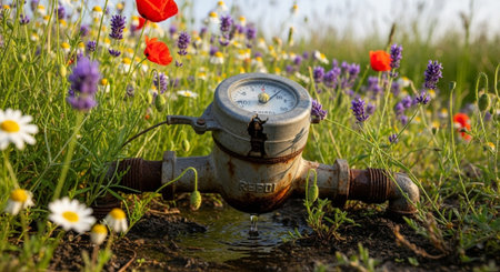 A detailed view of a water meter set against lush greenery, showcasing flowing water in a serene garden. Bright daylight enhances the vibrant colors.