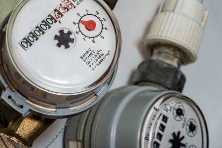 Saint Petersburg, Russia - July 30, 2020: The process of replacing the cold and hot water meter due to the failure of the flow control device. Close-up of old equipment