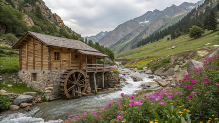 An aged wooden waterwheel is shown, actively turning and channeling water. The scene features a flowing river, bordered by stone and lush greenery. The background displays a mountainous landscape under an overcast sky. This image is suitable for various commercial uses related to nature and technology.