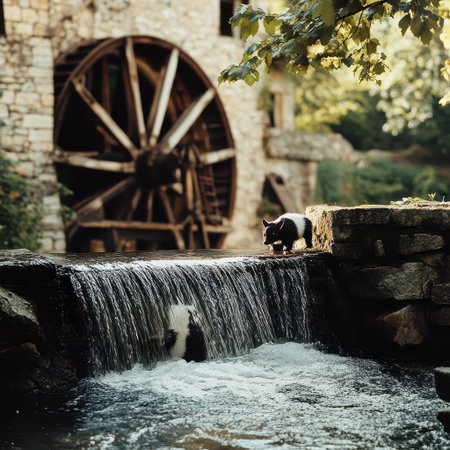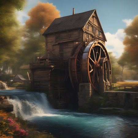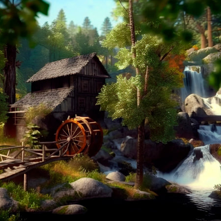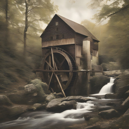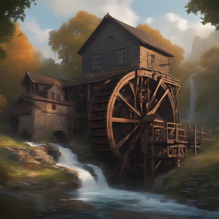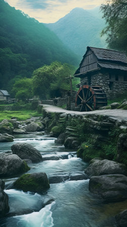 A peaceful scene featuring a rustic watermill beside a serene stream, surrounded by lush greenery and gentle ripples, evoking a sense of tranquility in nature.