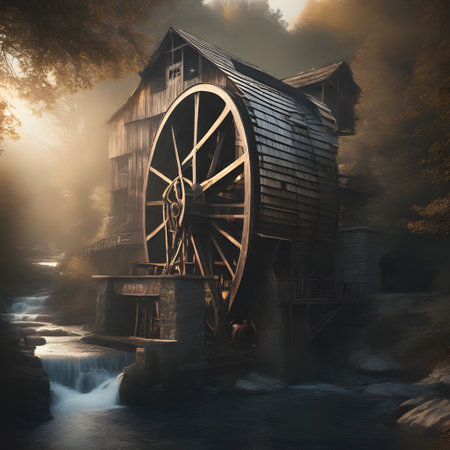 A scenic view of a traditional stone watermill featuring a large, turning wooden water wheel. The mill is situated on the bank of a flowing river, surrounded by lush green trees, embodying historical technology and rural charm.