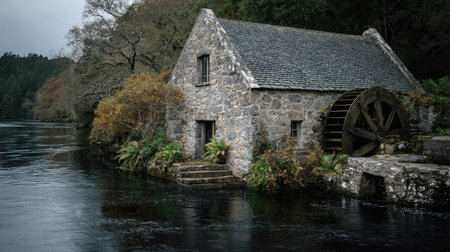 Stone watermill sits beside a calm river, surrounded by autumnal trees and foliage. The mill's exterior is made of weathered stone, and a large wooden water wheel is prominent. The scene evokes a feeling of tranquility and history.