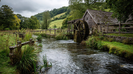 A wooden watermill stands beside a flowing river in a natural setting. The image showcases the mill's wheel, complemented by grassy banks and a backdrop of trees and hills. The scene is bathed in diffused light, suggesting an overcast day. This image could be suitable for various commercial and editorial applications.