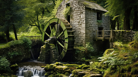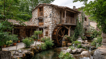 An aged stone building is the focal point, featuring a functioning water wheel. The scene showcases a verdant environment with flourishing greenery. The composition utilizes natural light, and the overall aesthetic suggests a tranquil, historical setting. This image could be suitable for various commercial and illustrative projects.