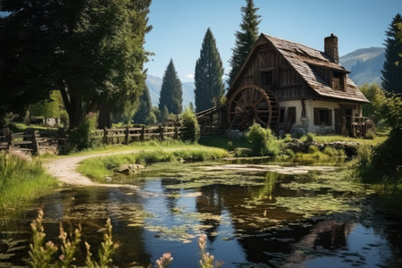 farmhouse surrounded by lush rolling hills, with stream and waterwheel in the background, created with generative ai