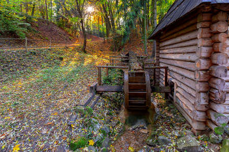 Wooden wheel of an ancient water mill in open-air museum,Ukraine.Lvov