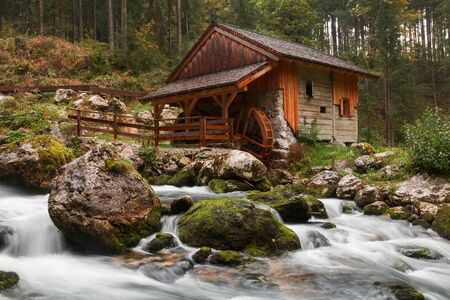 Old mill and beautiful Golling waterfall and near Golling and Salzach medieval town at autumn in Austria