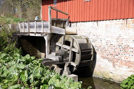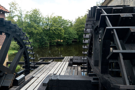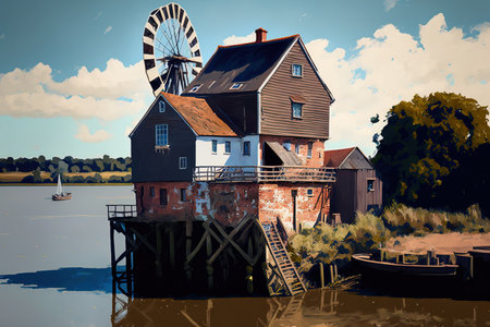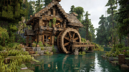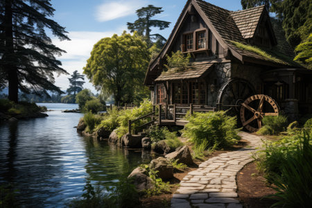 A wooden watermill stands next to a flowing river, surrounded by lush green vegetation. The scene depicts a natural environment with a rustic wooden structure. The lighting appears soft, possibly overcast, creating a calm atmosphere. The image could be used for various commercial or editorial purposes related to nature, history, and rural themes.