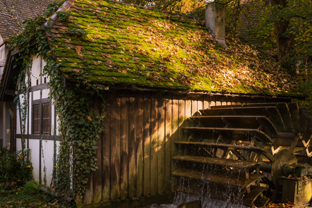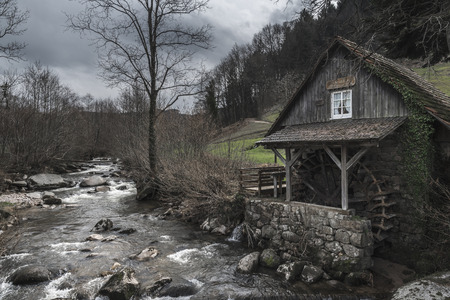 Vintage landscape with an old, abandoned water mill on an alpine river shore, on a cloudy day of early spring, in Schwarzwald, Germany.