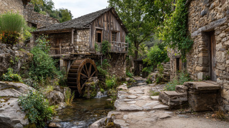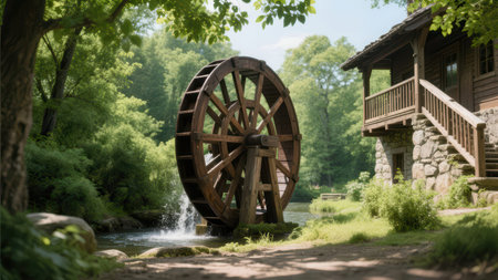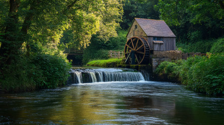 An aged wooden watermill stands on a tranquil stream, surrounded by rich foliage. The scene features a large water wheel and the building is constructed with stone and wood. The composition is well-lit, suggesting either a sunny day or professional lighting. Suitable for use in various visual media projects, including commercial applications.
