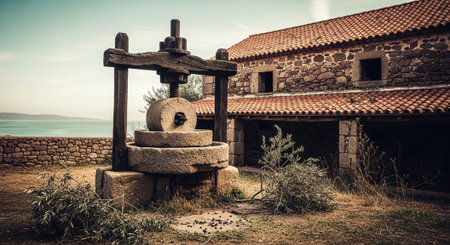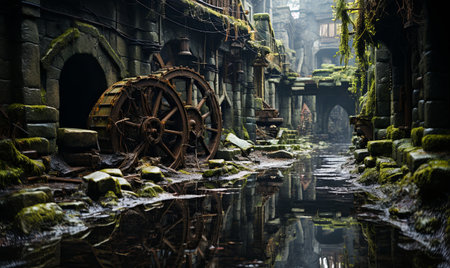 Generative AI : Ancient water mill mossy ruins in Fragas do Eume natural park Galicia Spain